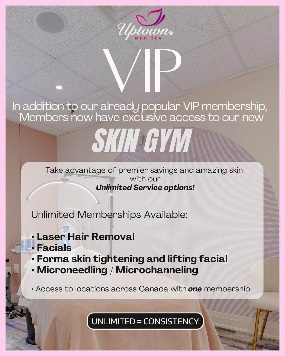 To celebrate our all new Skin Gym Memberships — offering over 50% in annual savings — we’re giving TWO lucky winners (1 in Ontario, 1 in British Columbia) the chance to enjoy FREE SERVICES for an entire year at Uptown Med Spa.